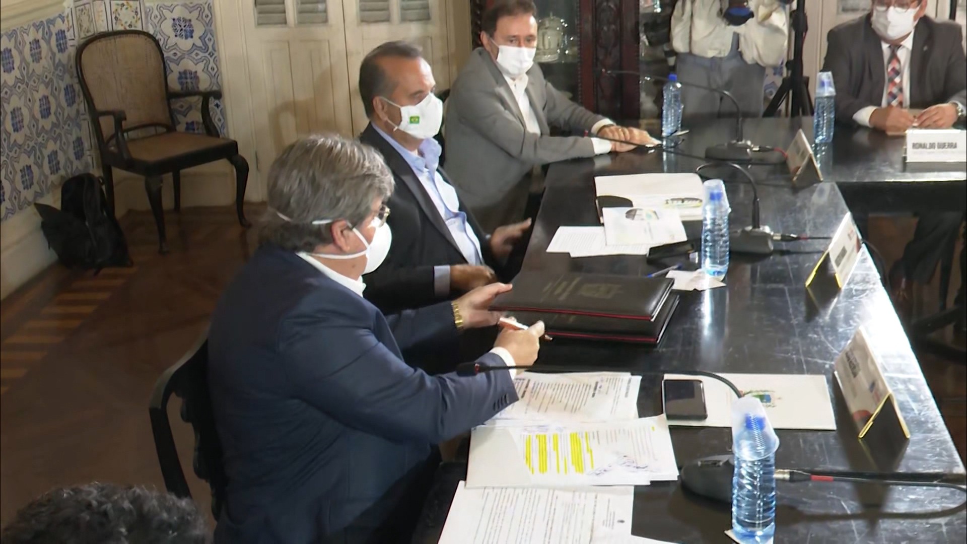 Encontro em João Pessoa reuniu os governos de Paraíba, Pernambuco, Ceará e Rio Grande do Norte com o ministro Rogério Marinho, do Desenvolvimento Regional. Ministro Rogério Marinho com o governador paraibano João Azevêdo TV Cabo Branco/Reprodução Os governos de Paraíba, Pernambuco, Ceará e Rio Grande do Norte assinaram nesta quinta-feira (29) um pré-acordo com o Ministério do Desenvolvimento Regional para definir os custos de recepção das águas do rio São Francisco aos estados beneficiados. Ficou definido no encontro que os estados terão um ano de carência e, a partir do segundo ano, começarão a custear de forma escalonada os gastos com a operação até o momento em que arcarão com a totalidade dos valores. O encontro aconteceu no Palácio da Redenção, sede do Governo da Paraíba. E, na ocasião, o ministro Rogério Marinho destacou que o objetivo principal do acordo é garantir a segurança hídrica aos quatro estados beneficiados com as obras de transposição do São Francisco. “O principal problema é com o custo da energia. Quem vai pagar esses valores. Então o acordo começa a resolver esse impasse”, explicou o ministro. Ele disse também que, como Paraíba e Pernambuco foram os primeiros estados a serem beneficiados com as obras, eles começam a pagar a cota mínima já este ano. O Ceará, que começou a ser beneficiado agora em 2021, vai começar a pagar no ano que vem. E o Rio Grande do Norte, que ainda vai começar a ser beneficiado, terá um ano de carência até o início da cobrança. No primeiro ano de pagamento, os estados arcam com 5% e o Governo Federal com 95%. E a parcela de cada estado vai crescendo ano a ano até chegar a 100% após cinco anos. Anfitrião do encontro, o governador paraibano João Azevêdo explicou que a cada um dos estados caberá o direito de definir a demanda de água que receberá a cada ano, a depender das necessidades provocadas por eventuais estiagens. E que é esse valor da vazão, variável, que deverá ser arcado por eles. Ele disse também que deve enviar à Assembleia Legislativa da Paraíba um projeto de lei que cria a taxa de segurança hídrica. De acordo com o Ministério, as negociações tinham sido iniciadas em 2016, mas só agora foram finalizadas. O primeiro pagamento por parte de Paraíba e Pernambuco deve acontecer em outubro. Participaram do encontro ainda os governadores Camilo Santana (Ceará) e Fátima Bezerra (Rio Grande do Norte) a vice-governadora Luciana Santos (Pernambuco).